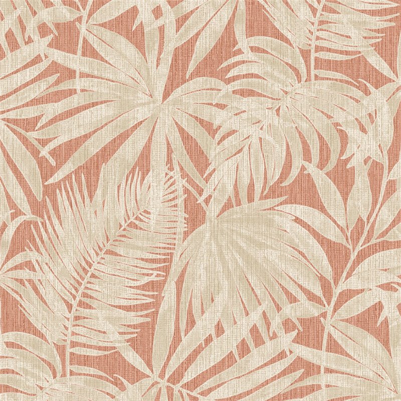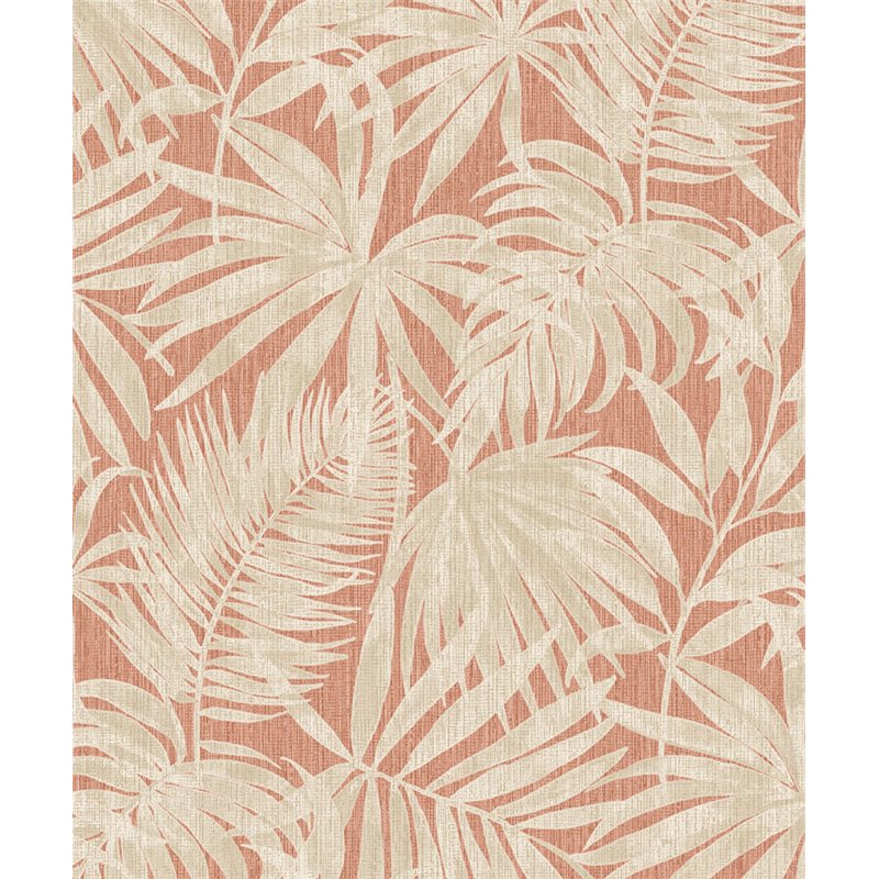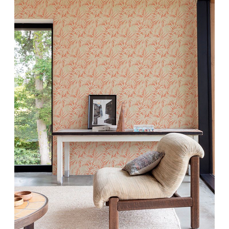 Papel pintado hojas de palmera color beige claro tropical. Crea un ambiente acogedor ideal para el recibidor. Un diseño que transforma cualquier ambiente.