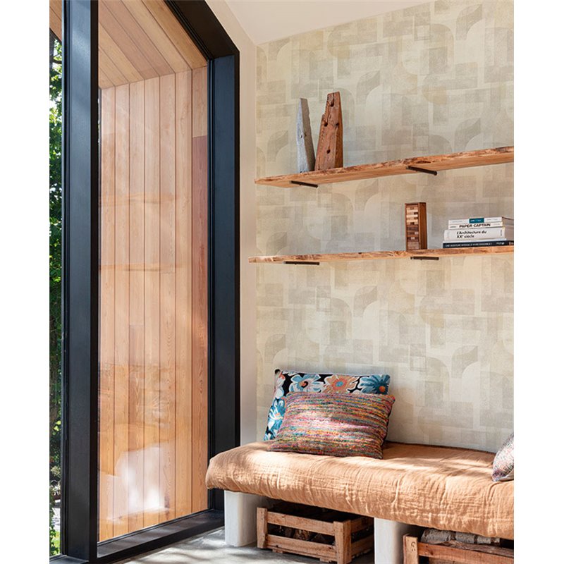 Papel pintado moderno geométrico beige y turquesa. Renueva tus espacios para una pared destacada. Ideal para quienes buscan calidez y estilo.