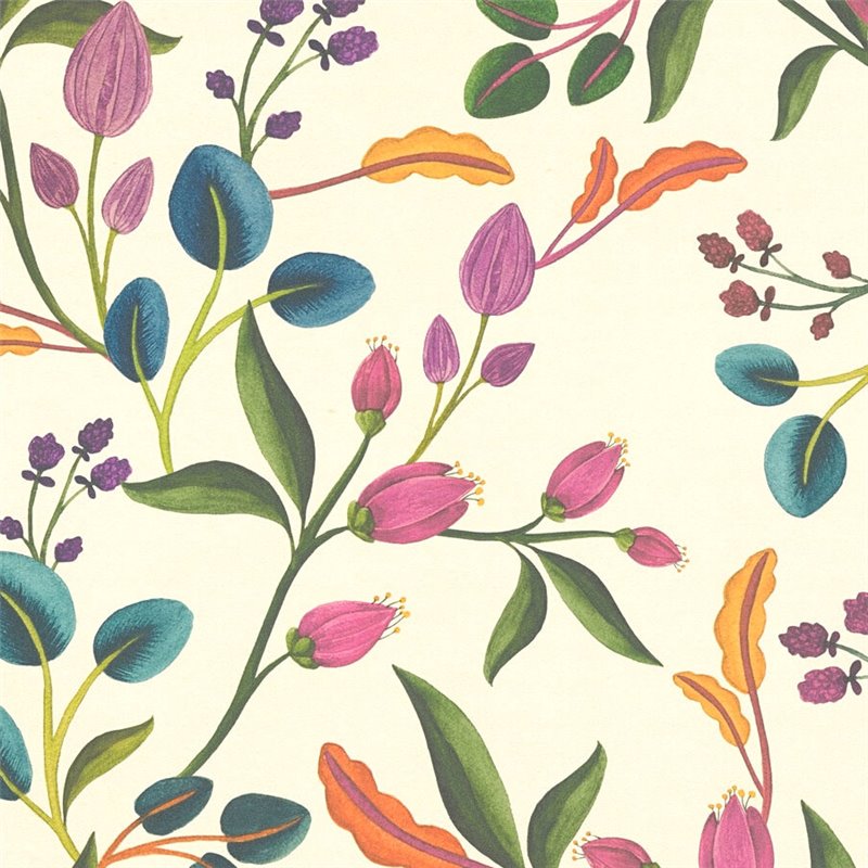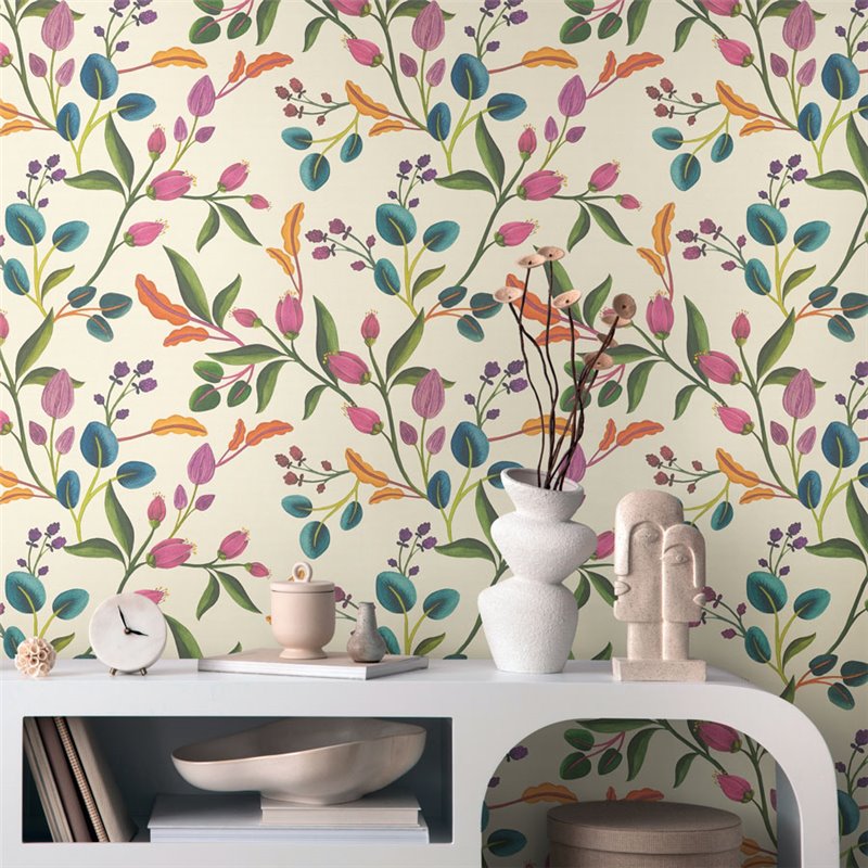 El papel pintado Painted Petals 2028782111 blanco crema tiene un diseño floral vibrante con ilustraciones detalladas de ramas, hojas y flores en tonos morados, azules, verdes y naranjas sobre un fondo claro.