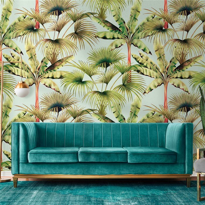 Decora tu espacio con un mural de pared tropical en tonos verde y rosa, con palmeras exóticas y un diseño vibrante que aporta frescura y elegancia a cualquier ambiente. Medidas: 159 x 280 cm