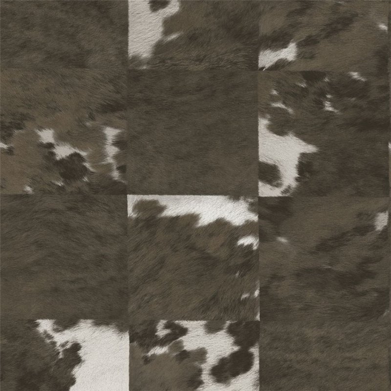 Papel pintado vinílico piel de vaca en marrón y blanco que aporta un toque rústico y distintivo. Medidas del rollo: 70 cm x 10 metros