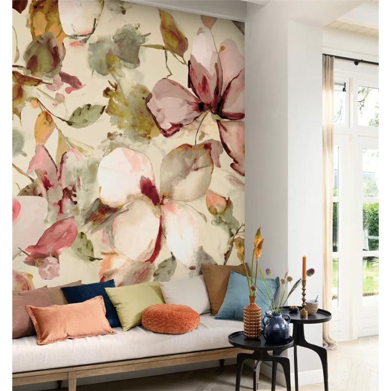 Mural pared magnolias efecto acuarela rosa pastel