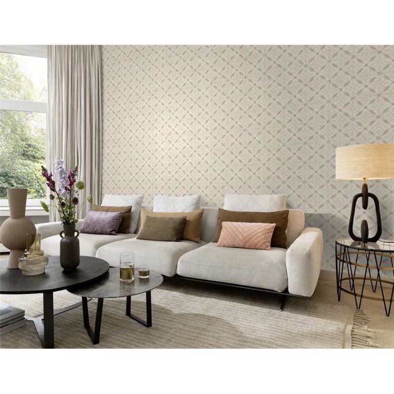 Este Papel pintado azulejos para baño beige con un acabado de calidad que enriquece visualmente la pared, creando un efecto envolvente y sereno. Rasch Beachhouse 410273.