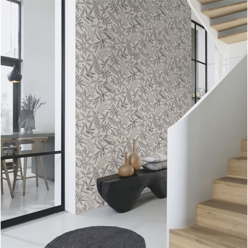 Este Papel pintado hojas dibujadas beige diseñado para aportar dinamismo y equilibrio visual a paredes de interiores contemporáneos. Rasch Schöner Wohnen 600551.
