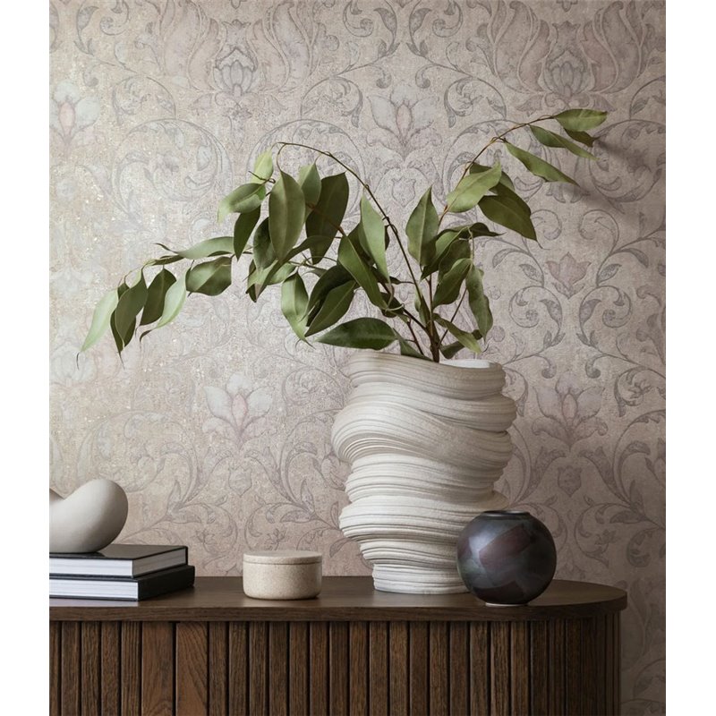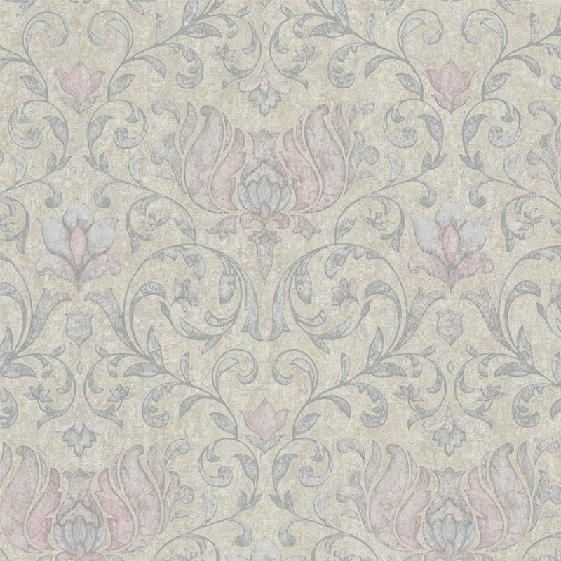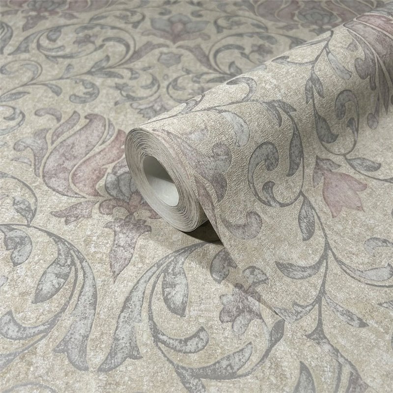Papel pintado barroco greige y rosa con detalles florales