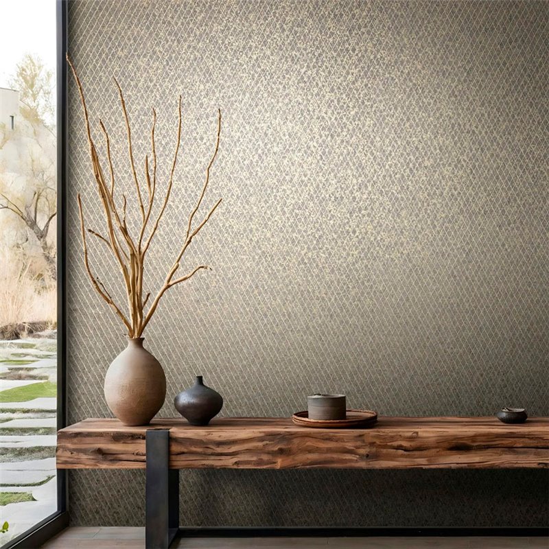 Papel pintado enrejado, patrón de diamantes beige moderno, con un efecto visual llamativo. Marburg Ritus 35535.