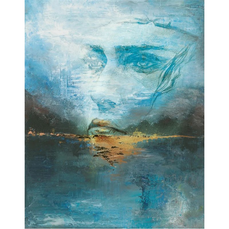 El mural de pared Marburg Ritus cautiva con un rostro etéreo que emerge entre brumas azules y matices dorados. Su composición artística evoca misterio, introspección y calma. Medidas: 212 x 270 cm
