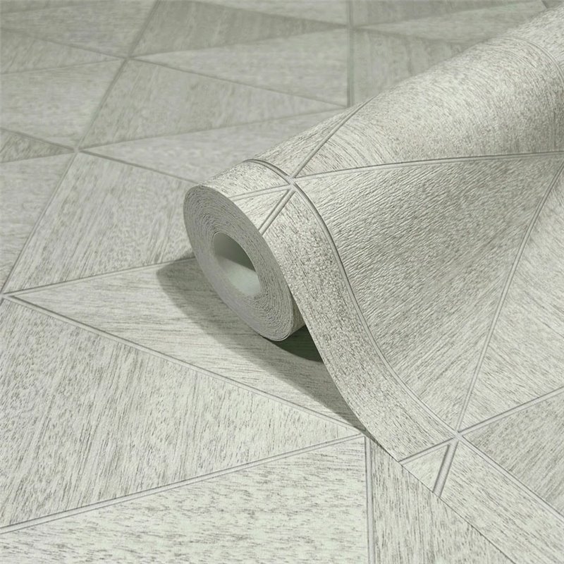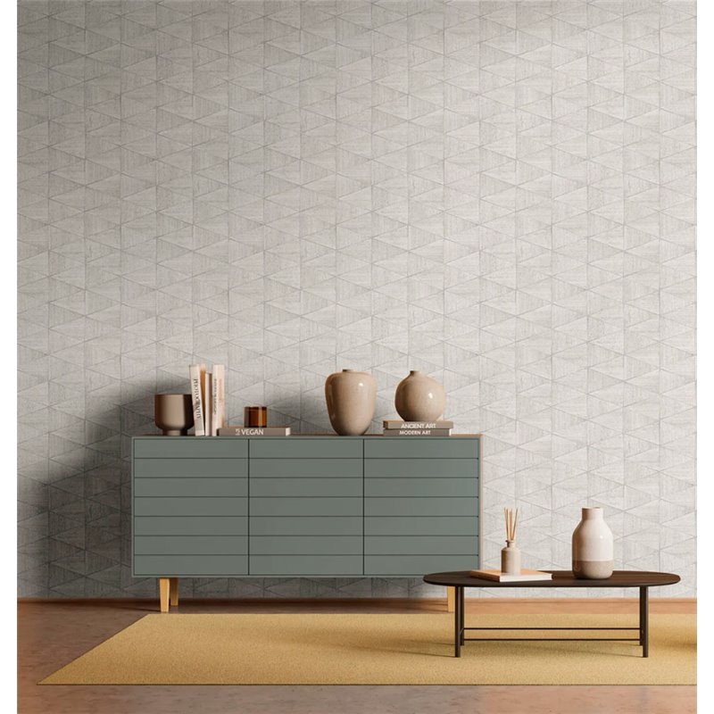 Una opción decorativa con gran carácter es papel pintado geométrico efecto madera gris moderno Marburg Travertino 33355.