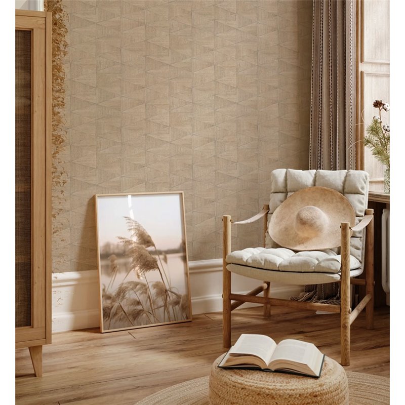 Diseñado para transformar tus espacios, papel pintado geométrico efecto madera beige moderno Marburg Travertino 33358.