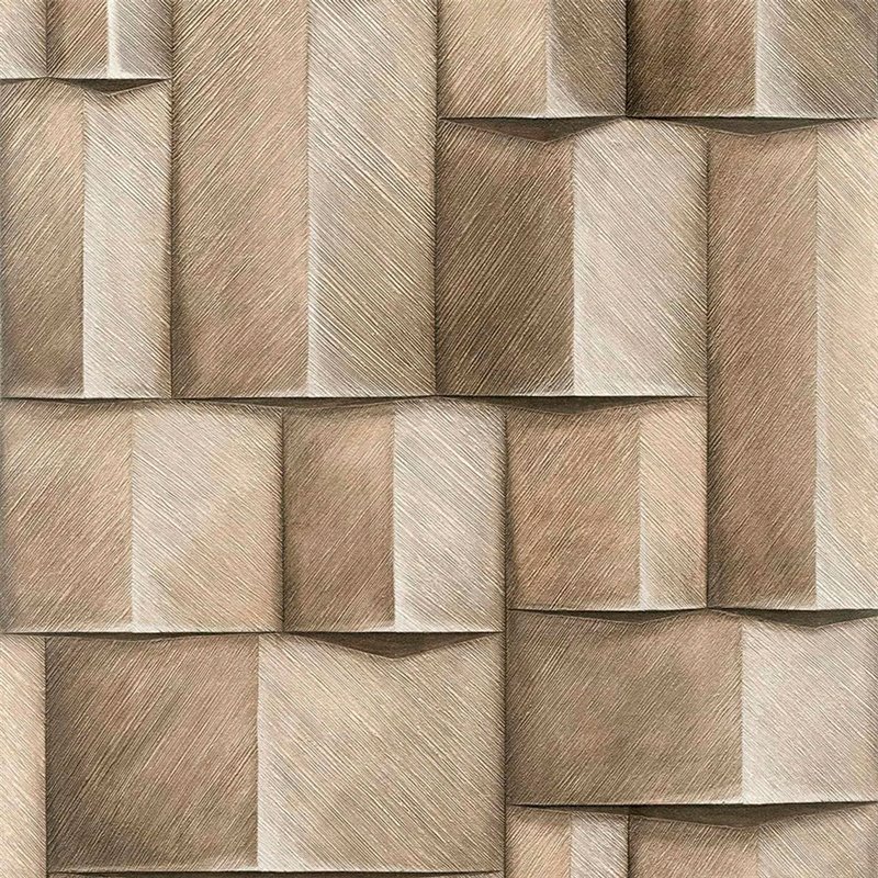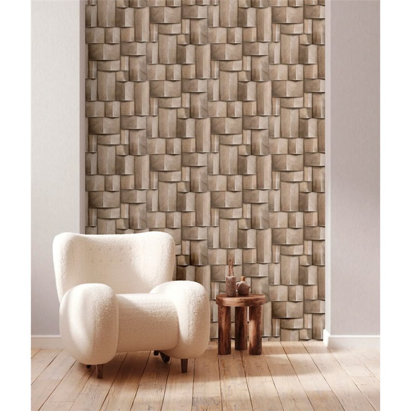 Papel pintado bloques madera 3D marrón y beige moderno
