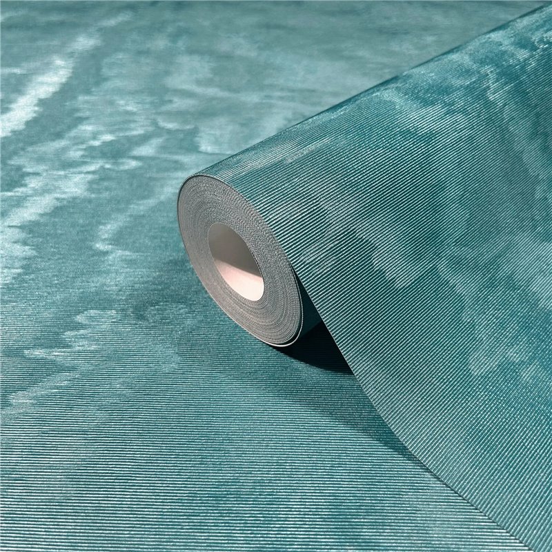 Papel pintado efecto seda color petróleo moderno, ideal para destacar tus paredes. Marburg Eclectic 86544.