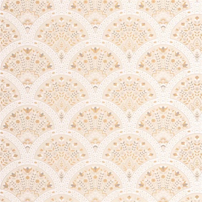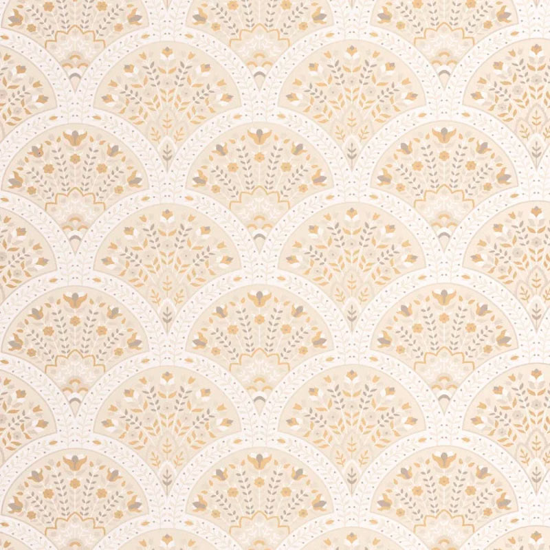 Papel pintado floral con abanicos elegantes color mostaza. Vibrante para un comedor sofisticado.