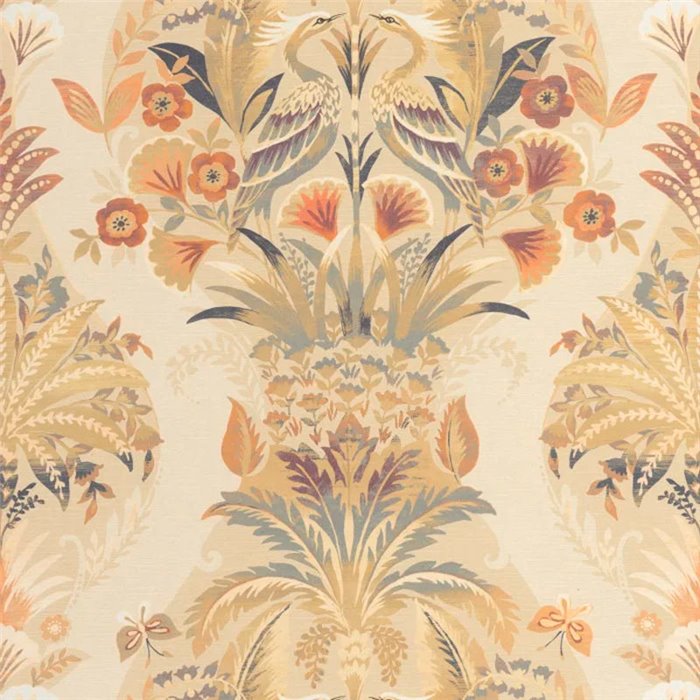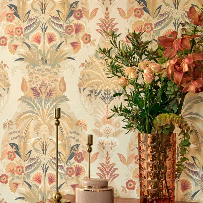 Papel pintado floral clásico con elegante plumaje, esbeltas palmeras y flores exóticas. Sofisticado para un comedor.