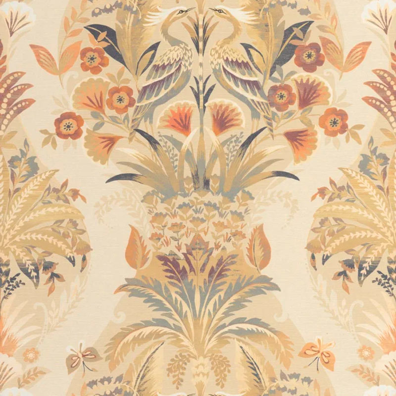 Papel pintado floral clásico con elegante plumaje, esbeltas palmeras y flores exóticas