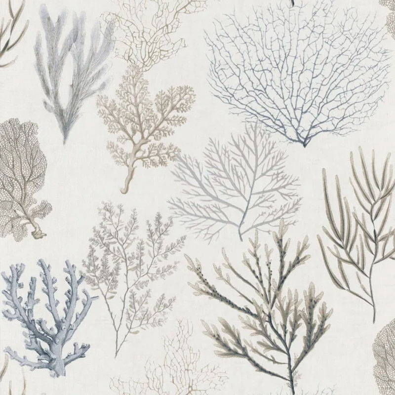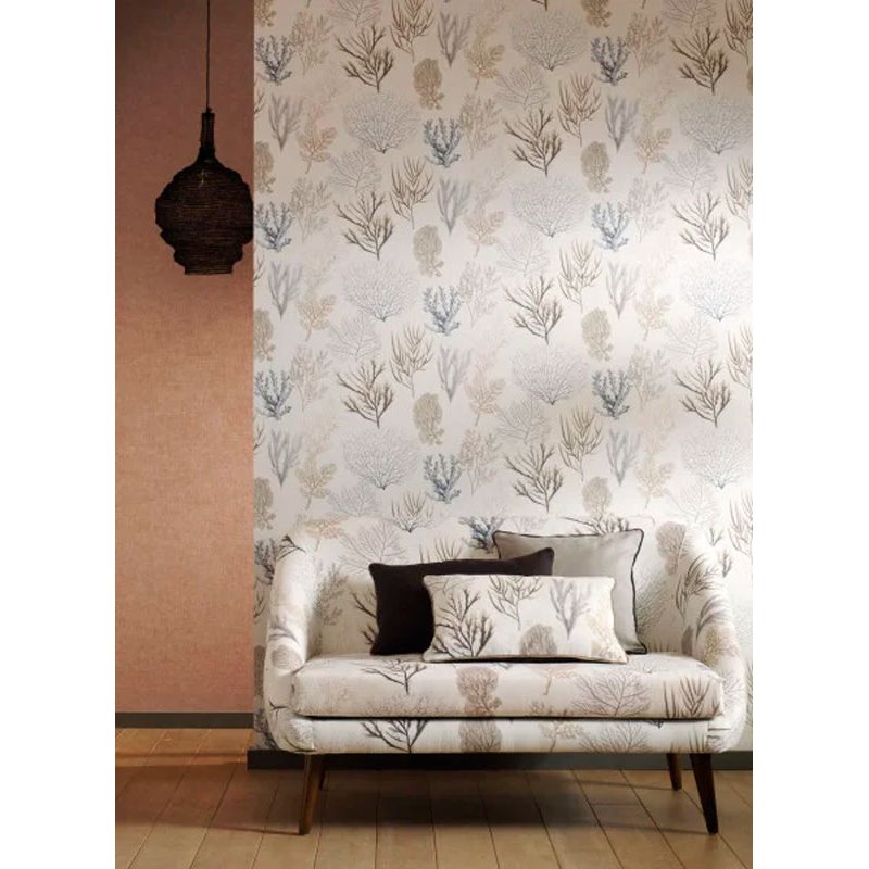 Papel pintado corales tonos neutros con fondo blanco. Elegante para un baño sereno.