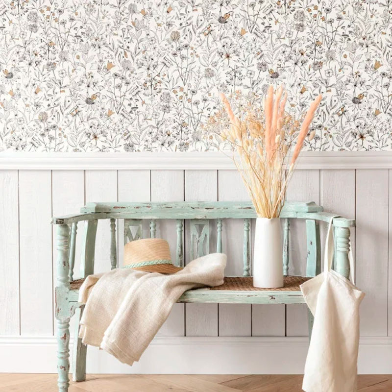 Papel pintado flores silvestres blanco y dorado, artístico y encantador