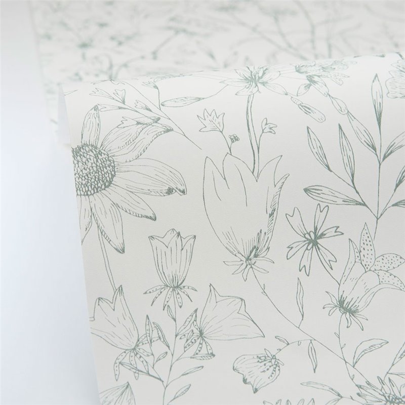 Papel pintado flores del campo verde estilo escandinavo. Caselio Art of Botany, papel de pared calidad tejido no tejido lavable. Medidas: 53 cm x 10 metros