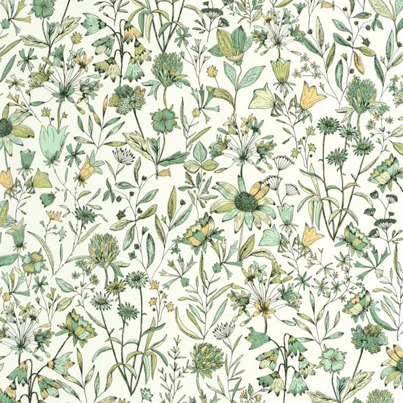 Papel pintado escandinavo flores verdes. Caselio Art of Botany, papel de pared calidad tejido no tejido lavable. Medidas: 53 cm x 10 metros