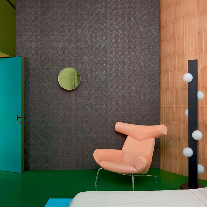 Papel pintado geométrico en relieve de inspiración art decó que ofrece textura y sofisticación. Medidas del rollo: 1 x 10 metros