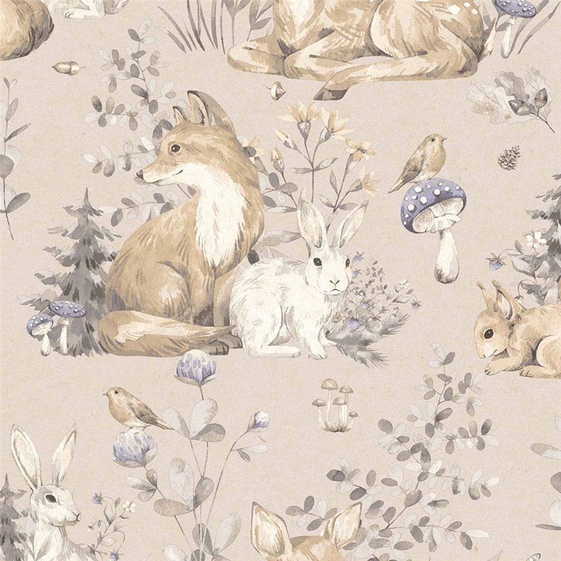 Papel pintado infantil con motivos de fauna y vegetación en fondo azul verdoso. Modelo MiniME 17103 de Cristiana Masi.