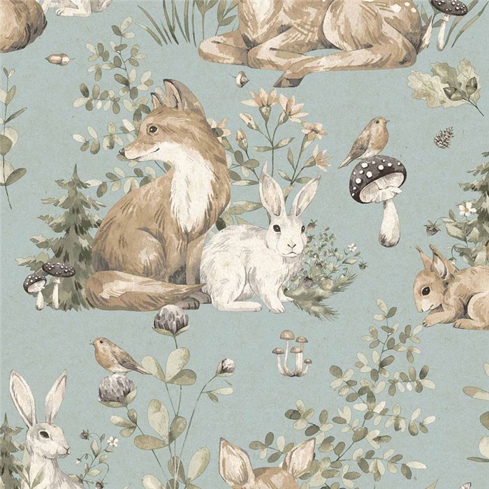 Papel pintado infantil con escena de bosque y animales en tonos beige. Diseño de la colección MiniME de Cristiana Masi.