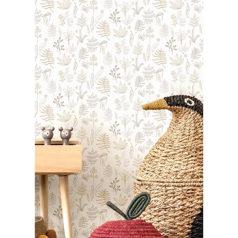 Este papel pintado infantil en azul y beige con hojas dibujadas aporta serenidad y naturalidad al dormitorio. Papel pintado hojas dibujadas azul y beige – Cristiana Masi MiniMe 17166.