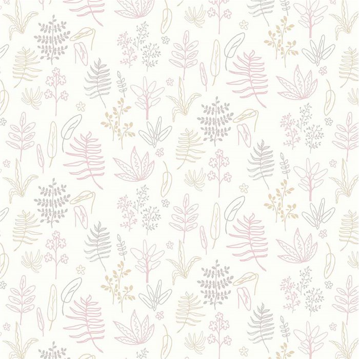 Papel pintado infantil hojas dibujadas en rosa y gris