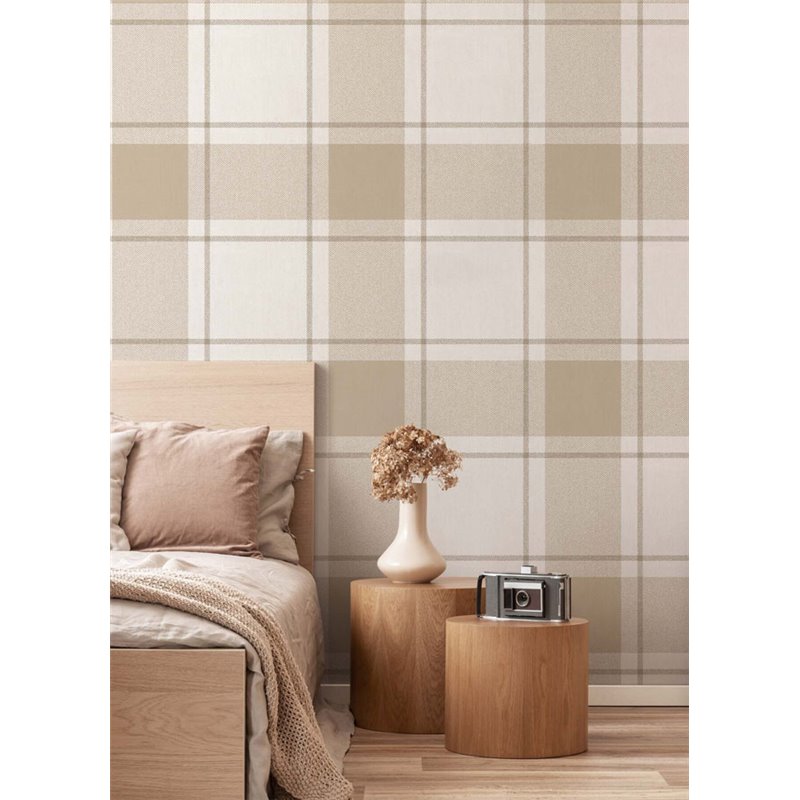 El papel pintado cuadros tartán arena suave Top Stripes 38402 de Cristiana Masi es ideal para decoraciones acogedoras y equilibradas.