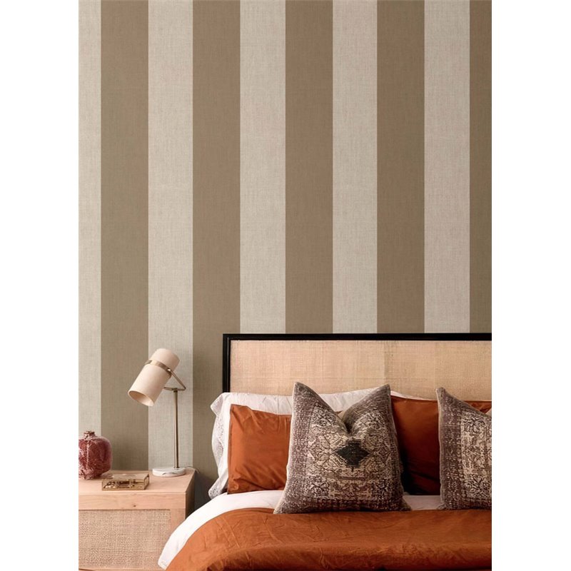 Papel pintado rayas anchas ocres de efecto textil y diseño atemporal, perfecto para ambientes cálidos. Modelo 38473.