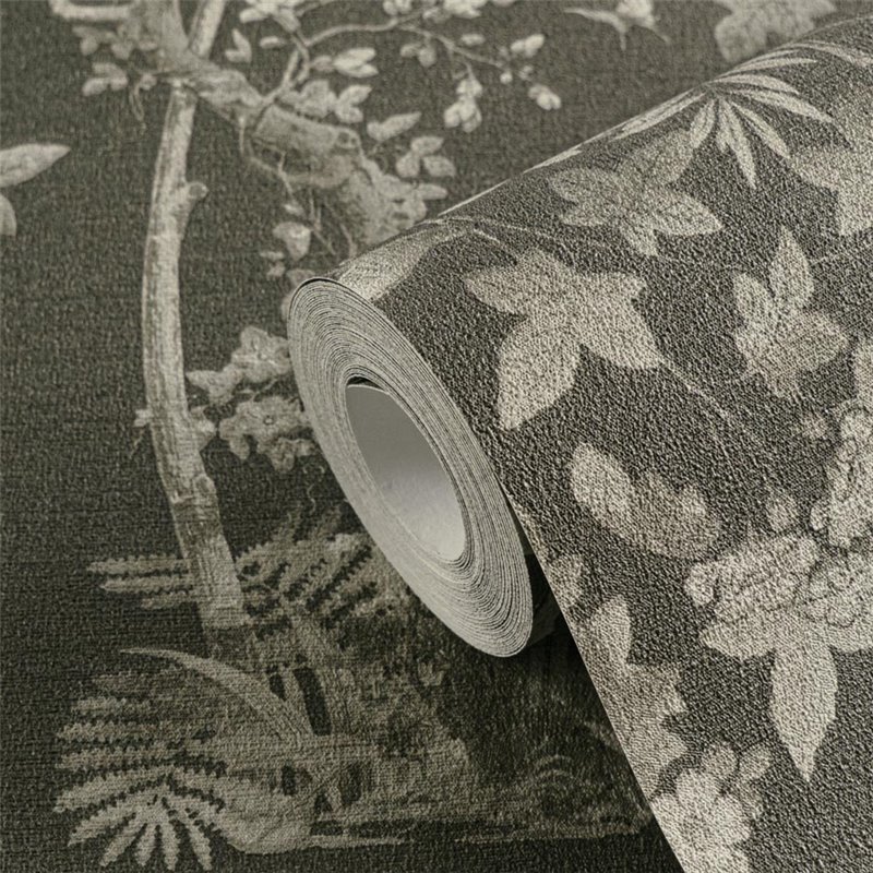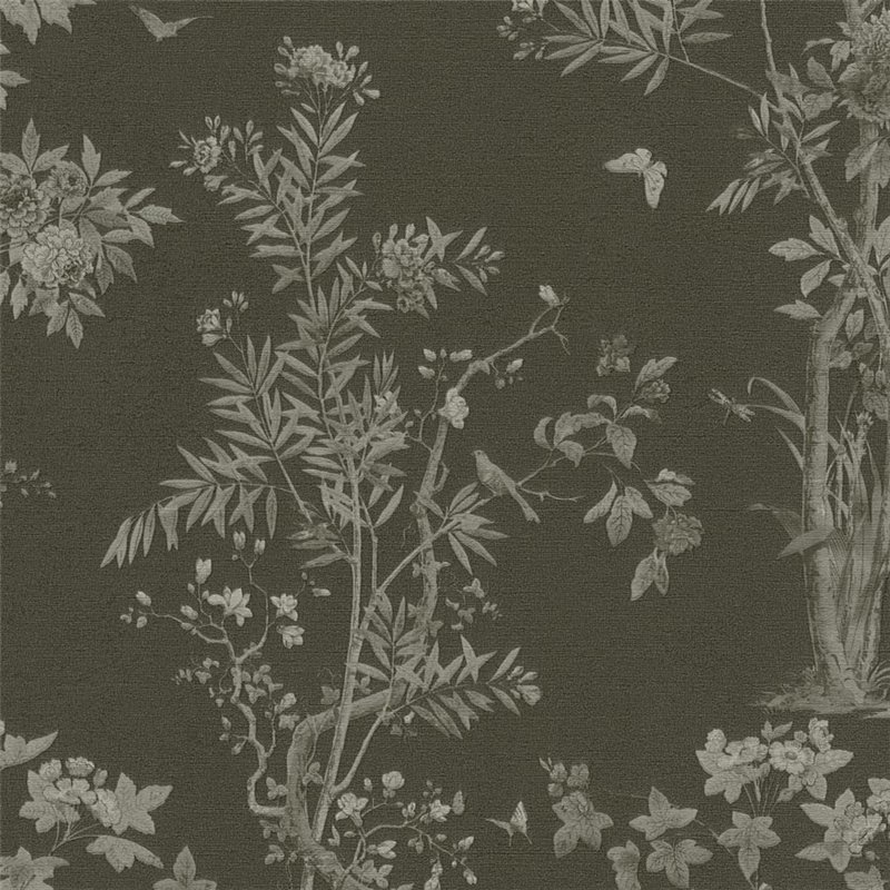 Composición floral de estilo romántico chinoiserie con pájaros en negro, un papel pintado ideal para salón y ambientes con carácter decorativo.