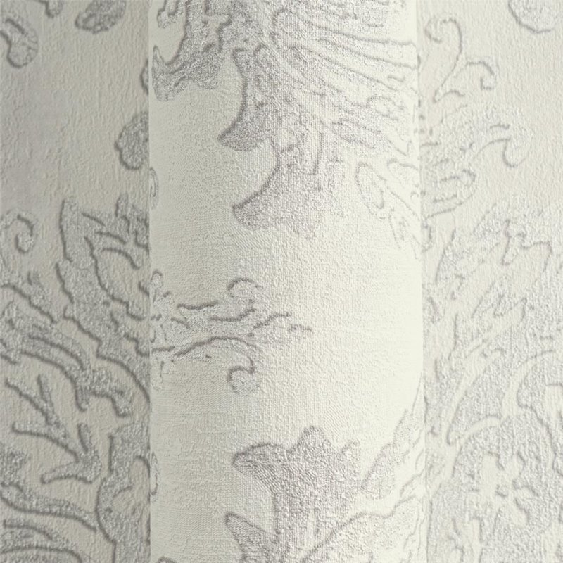 Composición damasco en plata y beige, un papel pintado pensado para boutiques de lujo con una estética sofisticada y armoniosa.