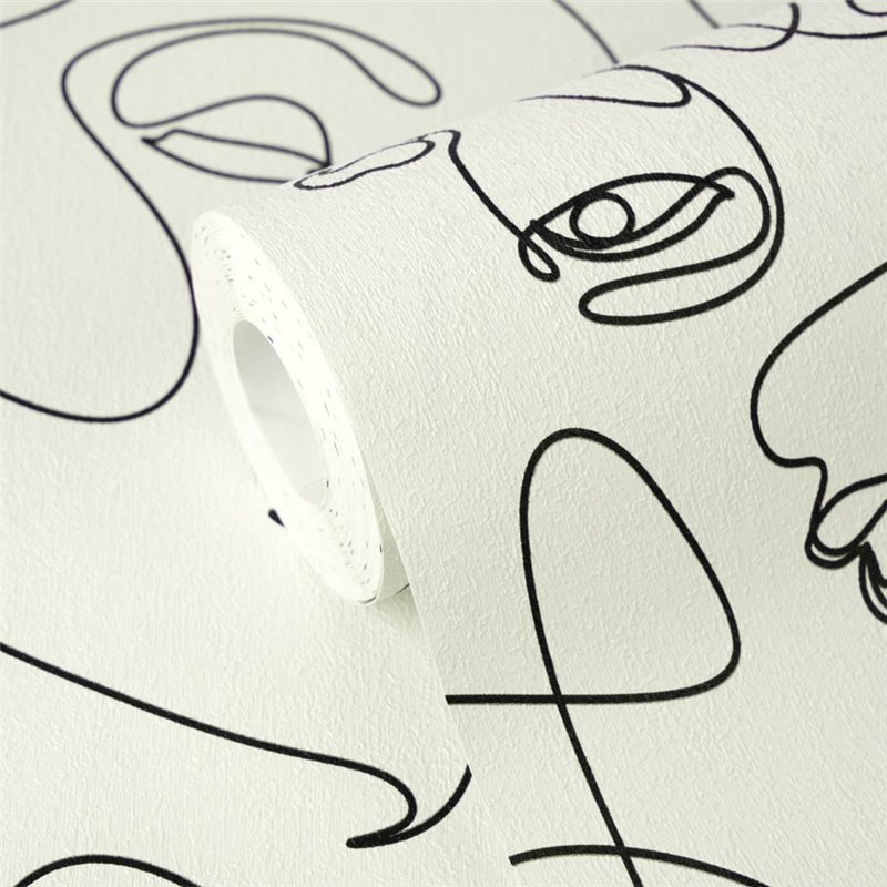 El estilo contemporáneo de rostros figurativos en blanco y negro define este papel pintado como una opción artística para salón o restaurante.