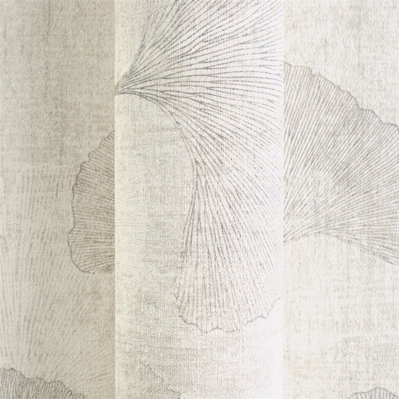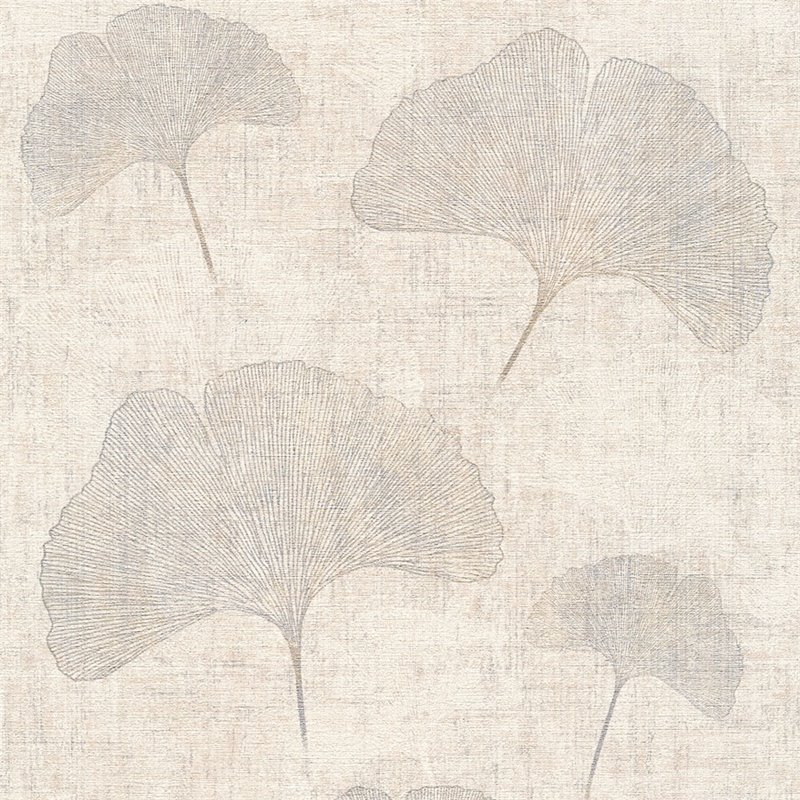 Un diseño de hojas de ginkgo en beige y gris aporta equilibrio y elegancia a este papel pintado, ideal para el salón con una atmósfera natural y sofisticada.