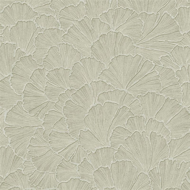 En el salón, este papel pintado elegante de hojas de ginkgo en verde salvia crea una atmósfera natural y sofisticada.