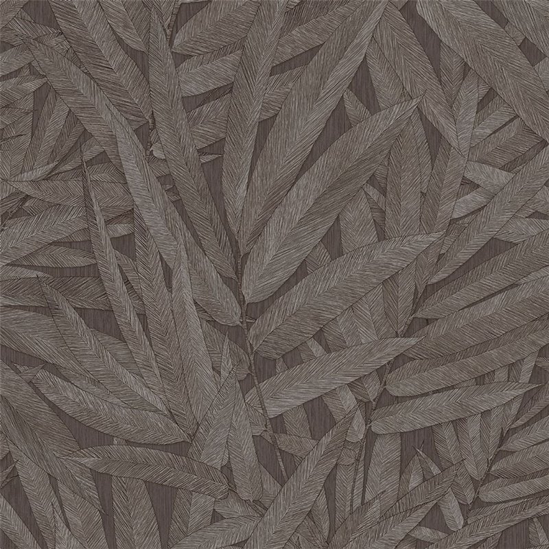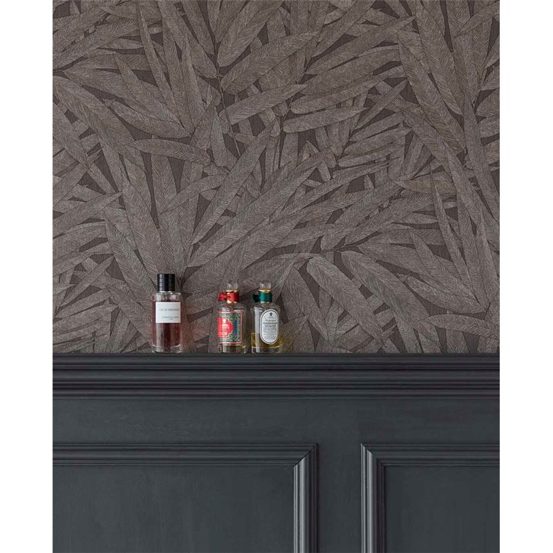Para hoteles o restaurantes, este papel pintado contemporáneo de hojas alargadas en marrón oscuro aporta presencia y un acabado sofisticado.