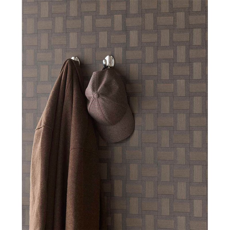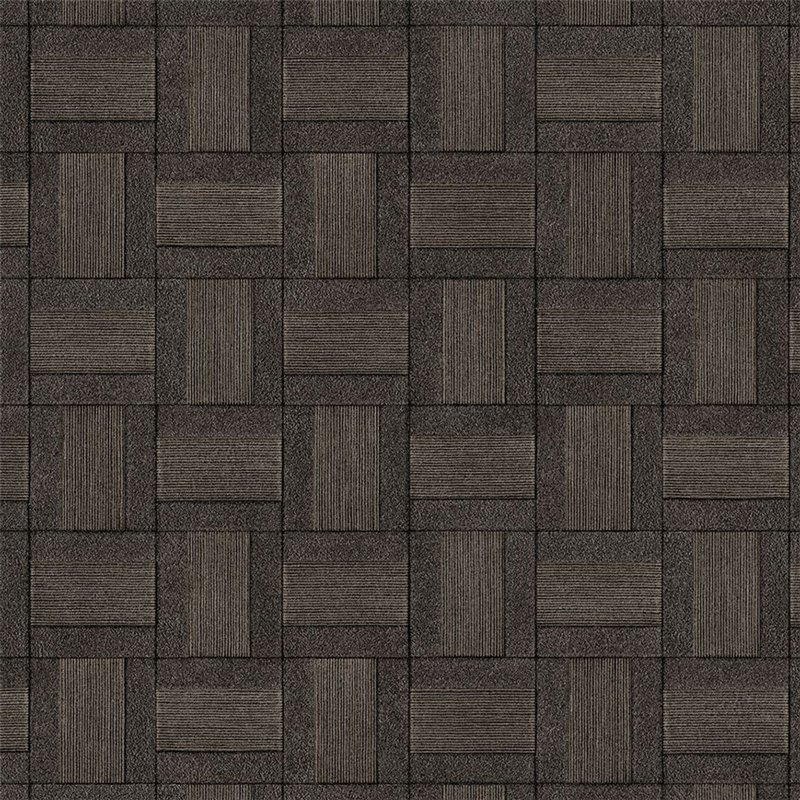Para salones o dormitorios, este papel pintado de cuadros de mimbre entrelazado en marrón oscuro aporta textura y un carácter envolvente.