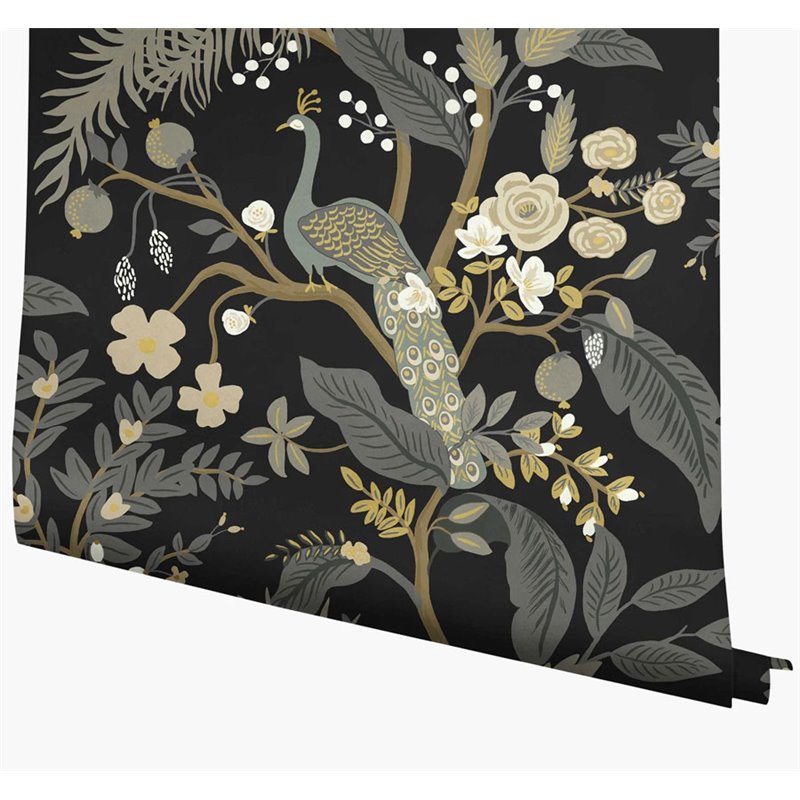 Papel pintado elegante floral pavos reales negro