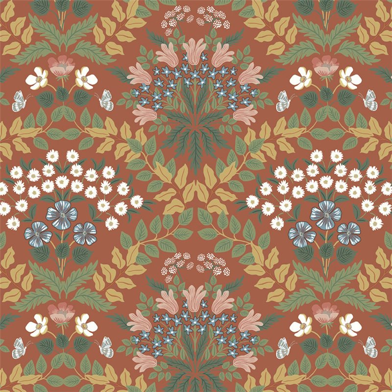 Diseño floral vintage en rojo que aporta un toque clásico y decorativo; un papel pintado con personalidad y fuerza visual.