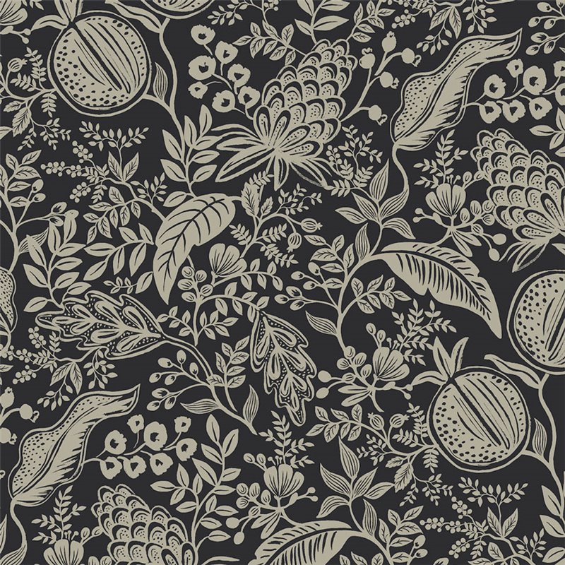 Estilo rústico con granadas en negro y beige, perfecto para un recibidor con carácter; papel pintado envolvente y sofisticado.
