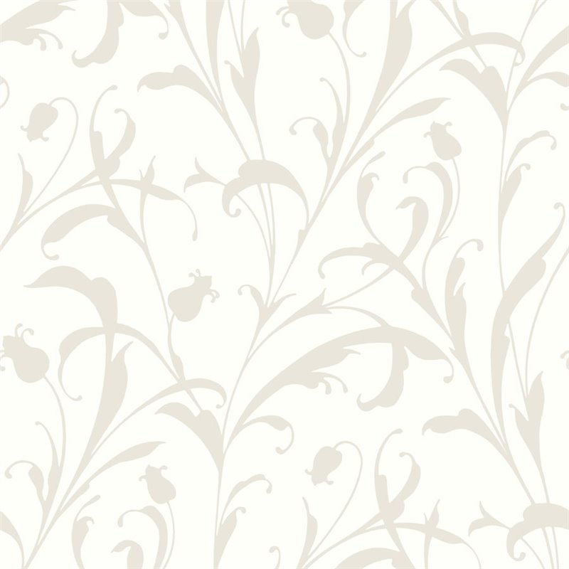 Un papel pintado floral arabesco blanco de estilo elegante con acabado brillo, ideal para salón, recibidor y boutique.