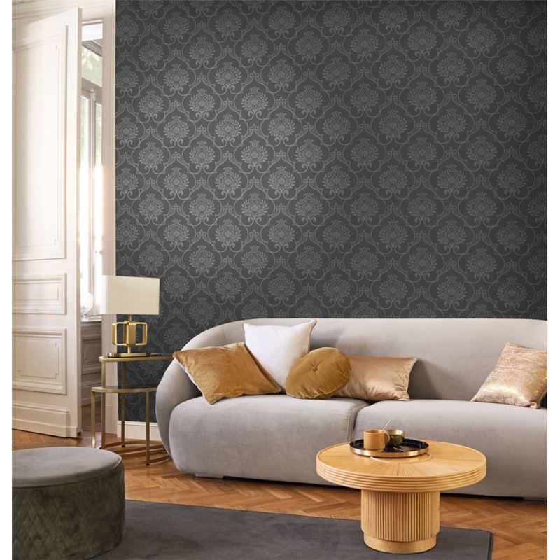 Un papel pintado damasco negro de estilo clásico con brillo metalizado y presencia sofisticada.