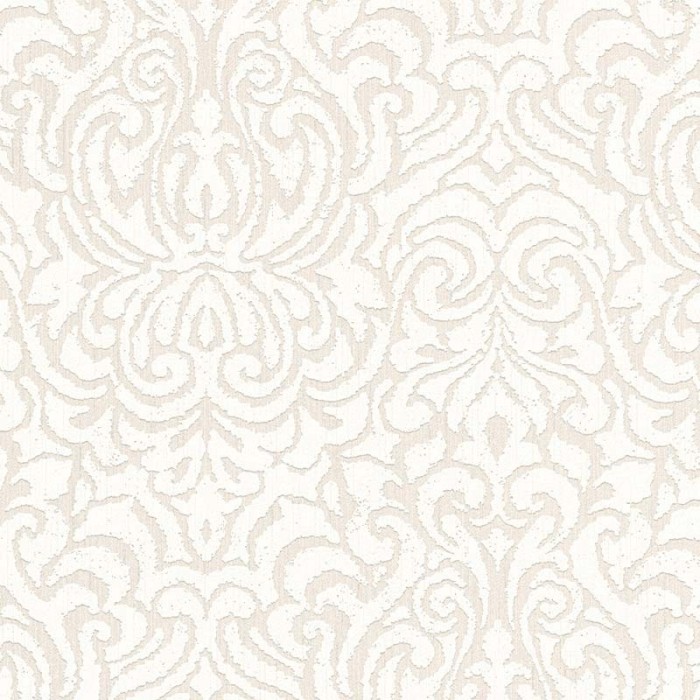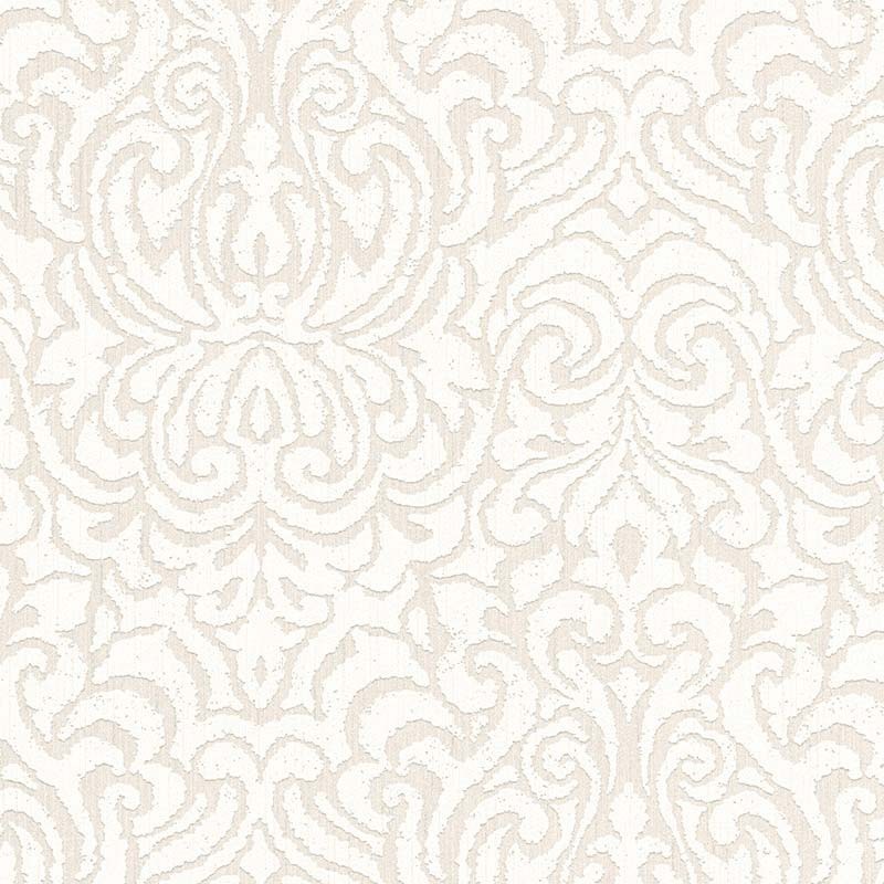 Beige Damasttapete mit Reliefmuster, klassisch und dekorativ. Architects Paper Tessuto II, waschbare Vliestapete. Maße: 53 cm x 10 Meters