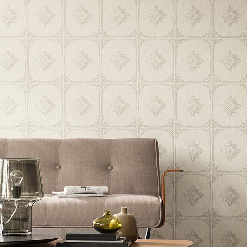 Klassische Tapete mit bestickten Ornamenten in Hellgrau und Creme, edel und fein. Architects Paper Tessuto II, waschbare Vliestapete. Maße: 53 cm x 10 Meters