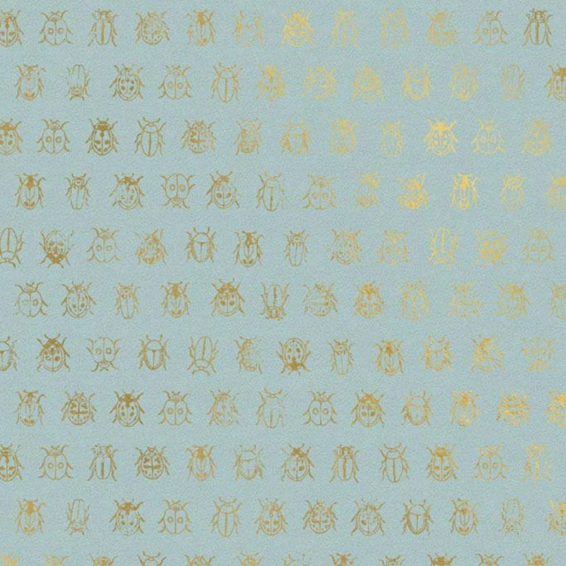 Hellblaue Tapete mit goldenen Insekten in Metallic, ein frisches Design voller Poesie und Eleganz. Pip Studio de Eijffinger, waschbare Vliestapete. Maße: 52 cm x 10 Meters