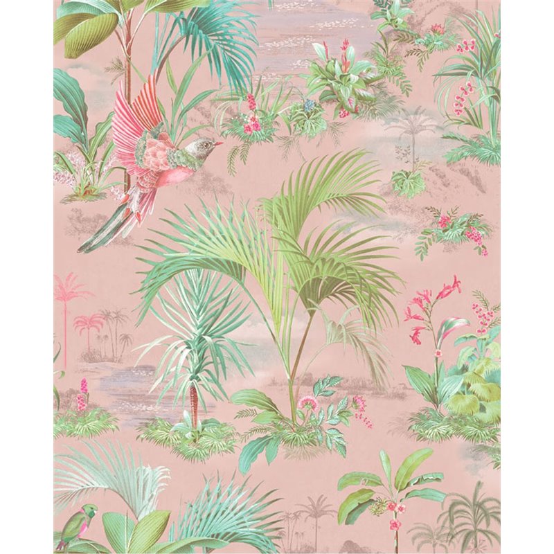 Tapete mit exotischen Pflanzen und tropischen Vögeln, ein lebendiges Muster, das Natur und Fernweh in den Raum bringt. Pip Studio de Eijffinger, waschbare Vliestapete. Maße: 52 cm x 10 Meters