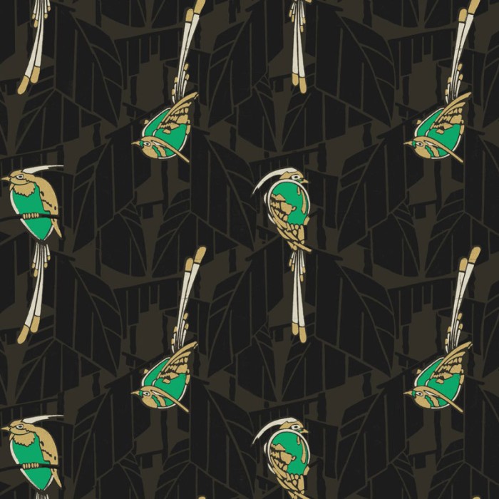 Art-Déco-Tapete mit Vögeln auf mosaikartigen Blättern