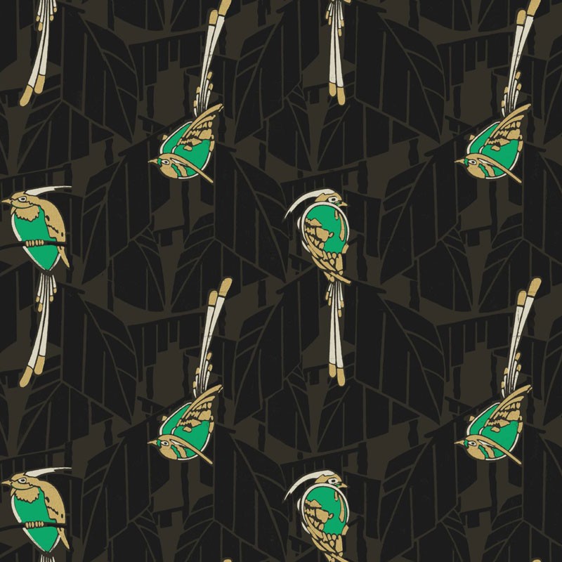 Art-Déco-Tapete mit Vögeln auf mosaikartigen Blättern von Khroma, Kollektion Folies. Vliestapete waschbeständig, Maße: 70 cm x 10 m.