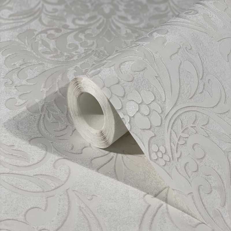 Tapete in metallischem Grau mit Damastmuster und Betoneffekt, bietet einen beeindruckenden visuellen Effekt. Marburg City Glam 32602.