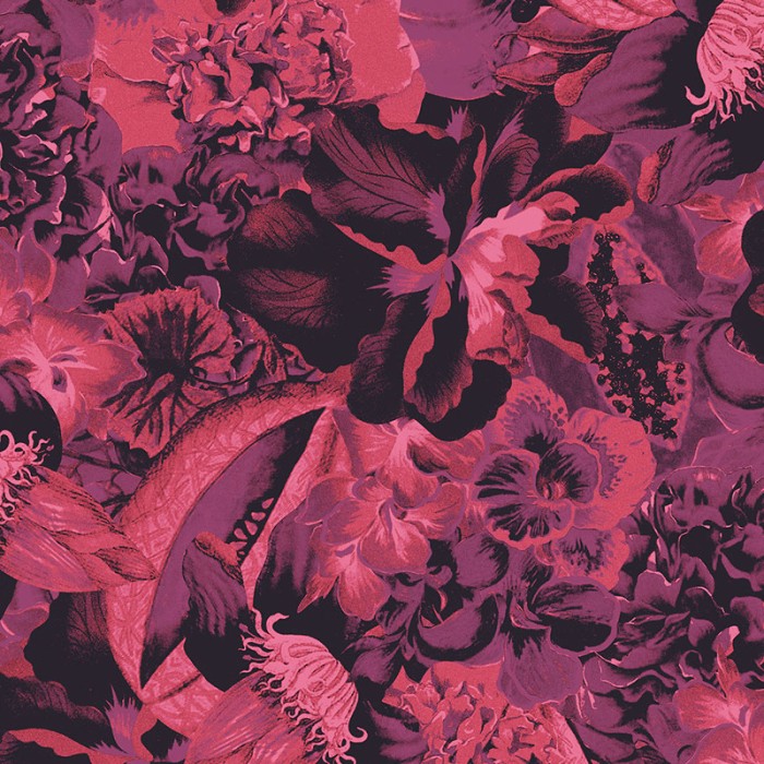 Tapete mit großen Blüten exotischer Obstbäume Rot und Purpur von Khroma, Kollektion Havana. Vliestapete waschbeständig, Maße: 53 cm x 10 m.