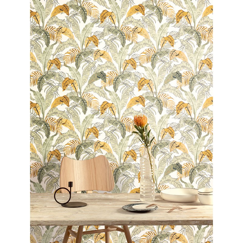 Tropische Bananenblätter-Tapete Grün und Honig von Khroma, Kollektion Lotus. Vliestapete waschbeständig, Maße: 53 cm x 10 m.